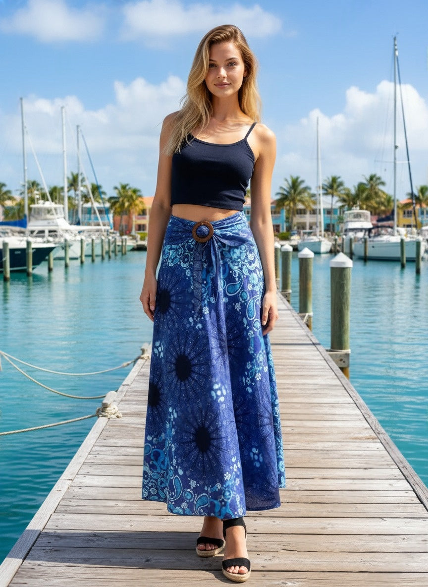 Lightweight, relaxed, and comfortable yet elegant long, flowy, bohemian-style skirt with elasticated waist. This skirt can be converted and worn as a haulter-neck dress.