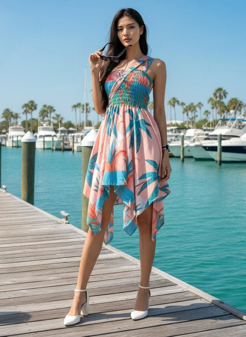 Flowy hem, bodycon knee length halter neck flared summer dress with expandable elasticated breast smocked tube top.