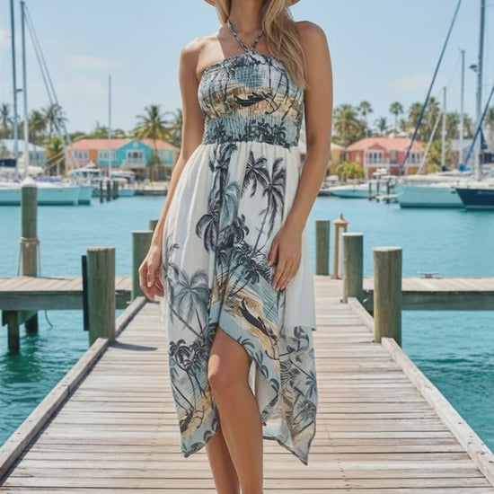 Flowy hem, bodycon knee length halter neck flared summer dress with expandable elasticated breast smocked tube top.