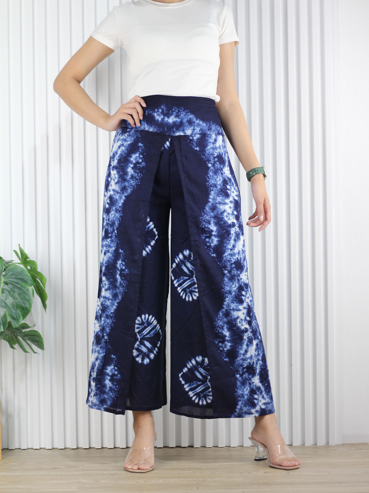 Wide bottom light weight summer pants with overlay flapped front. Structured A-line silhouette that flares gently from the waist. Back of waist elasticated for comfort.
