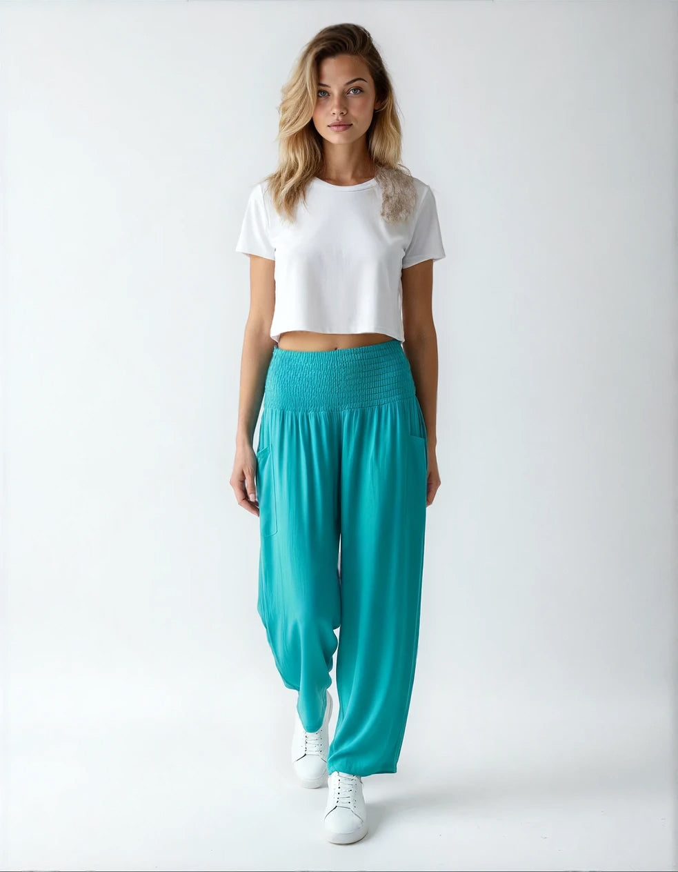 Loose legs with comfy ruffled high-cut elasticated waist band and single side pocket.