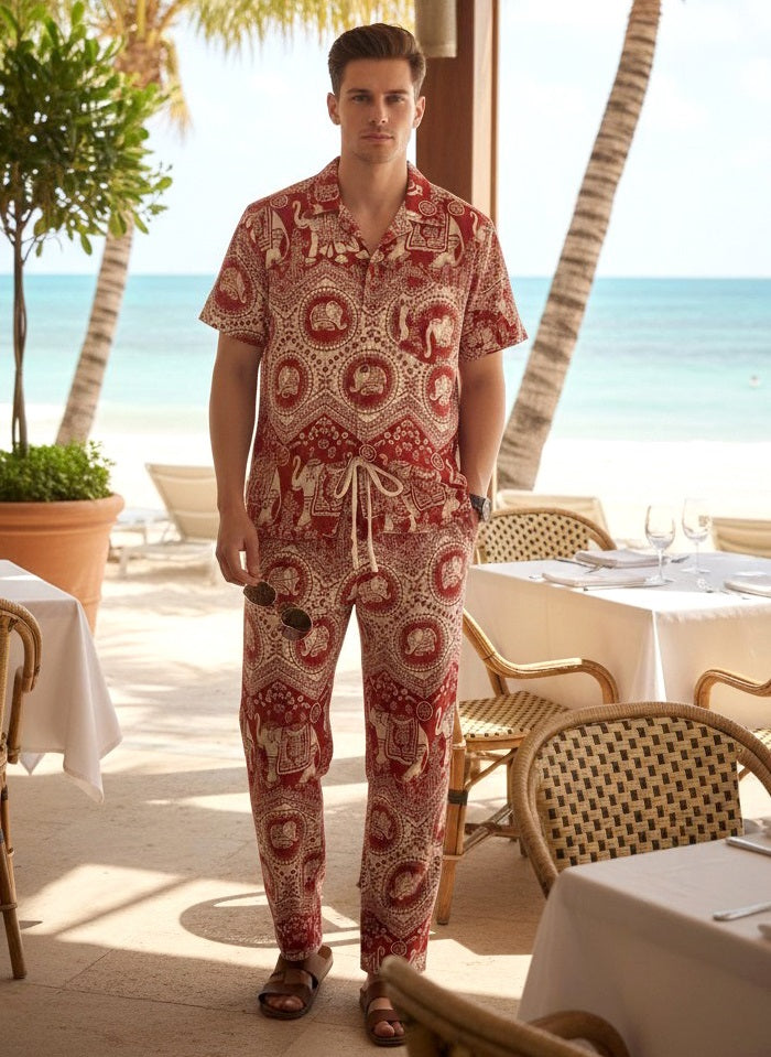 Lightweight, relaxed twin set consisting of long pants/trousers and shirt available in 4 sizes.