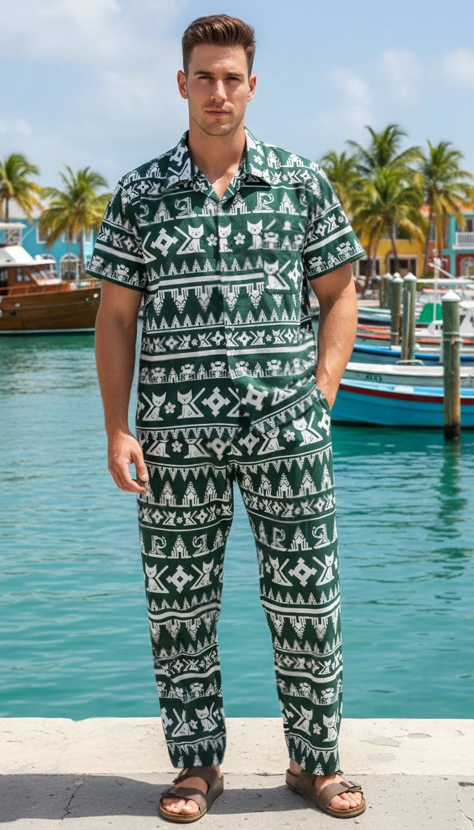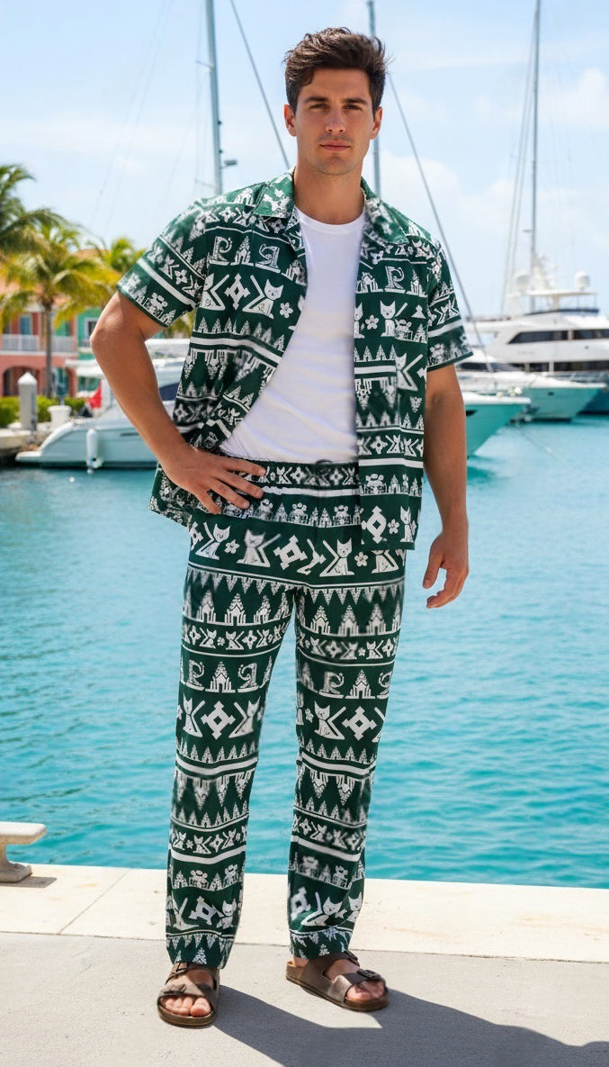 Lightweight, relaxed twin set consisting of long pants/trousers with 2 side pockets and shirt available in 4 sizes.