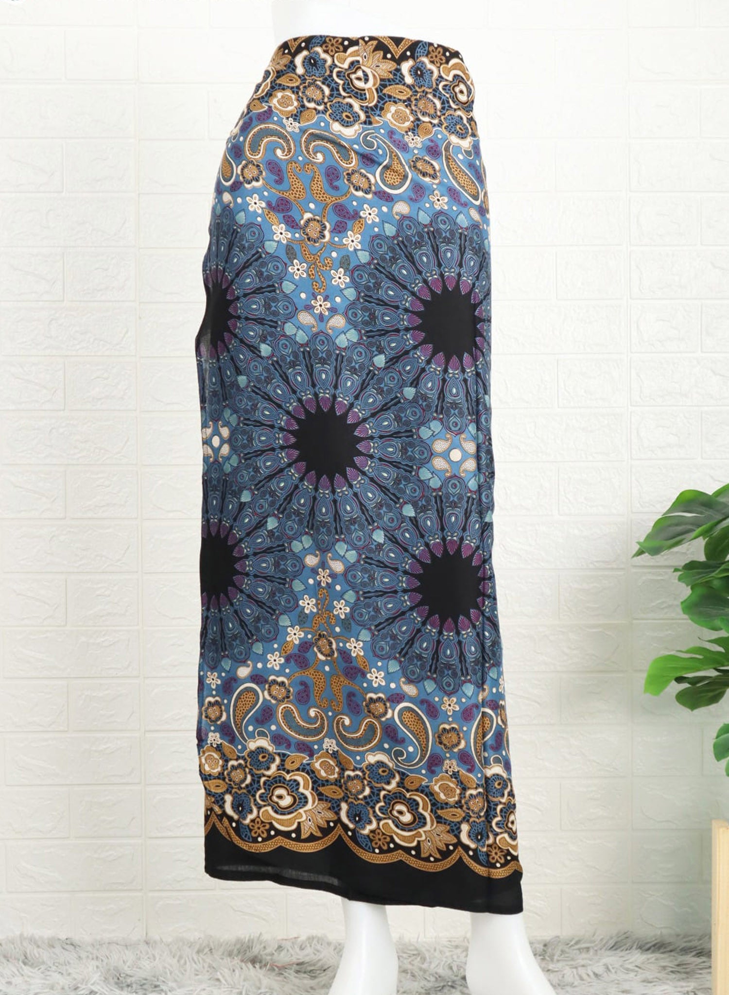 Wrap around sarong skirt with tie strings.