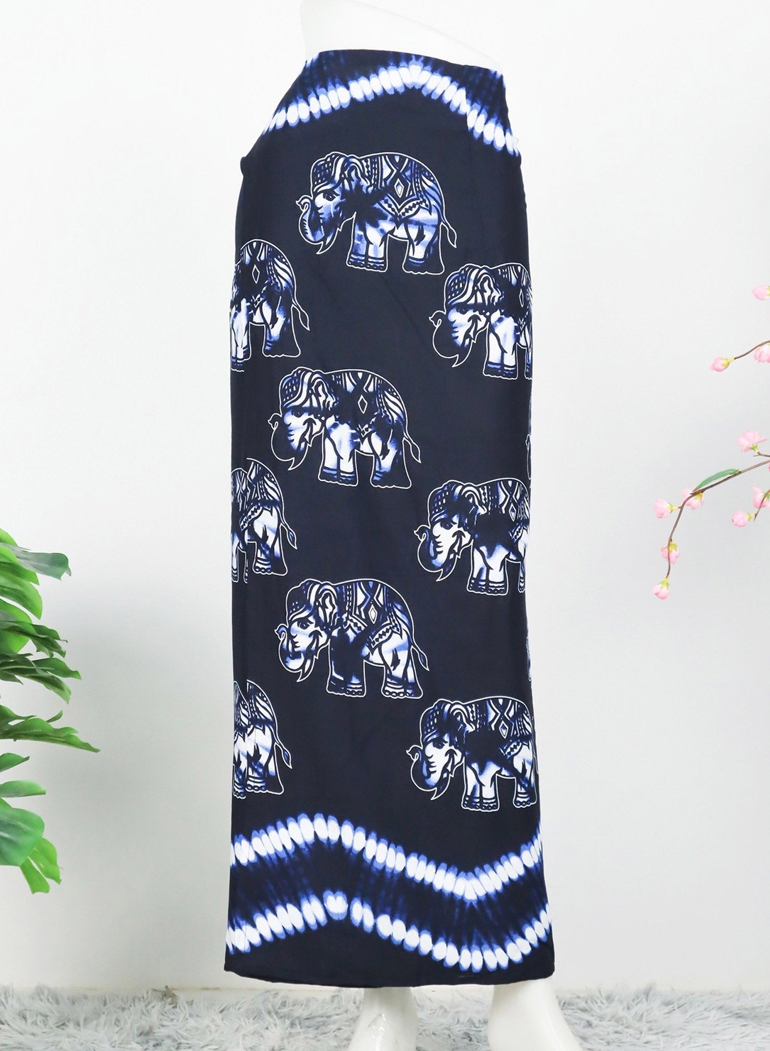 Wrap around sarong skirt with tie strings.