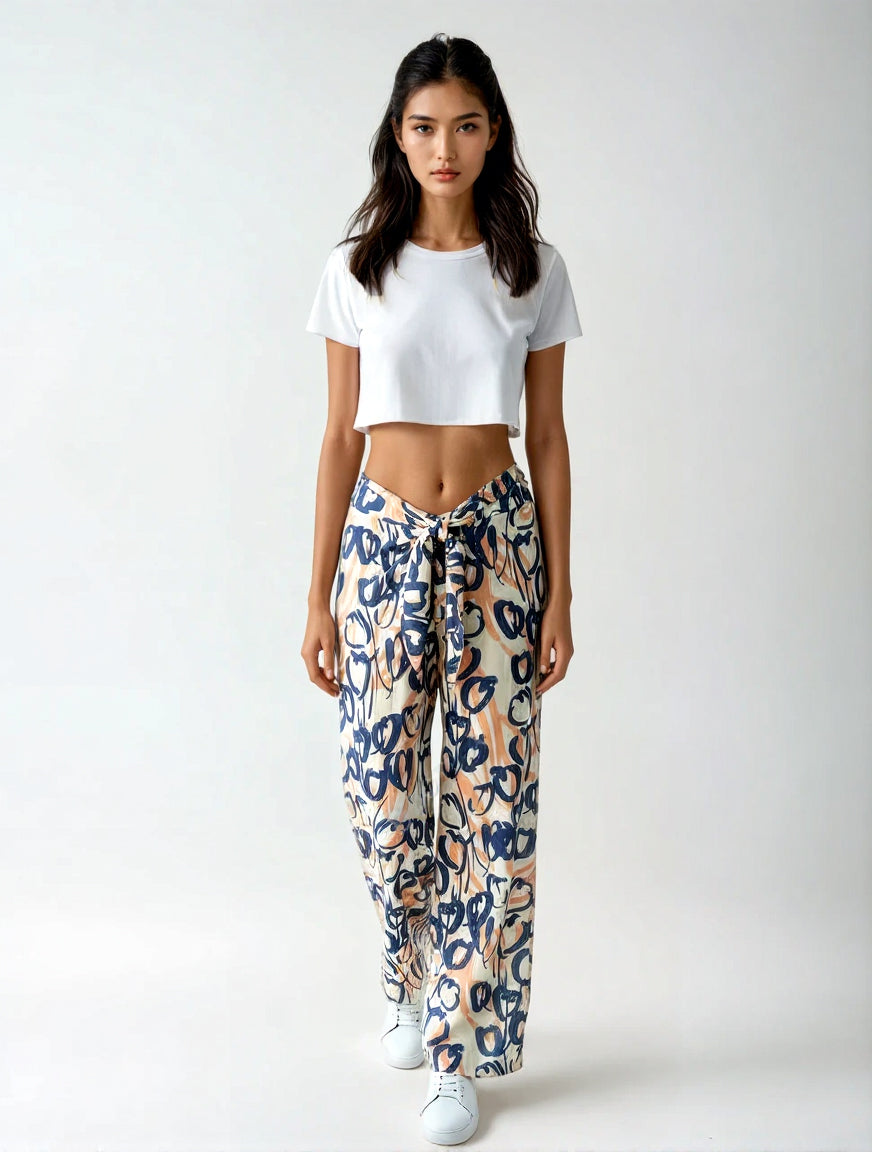 Loose fitting straight legged trousers with ties at the front and elasticated waist at the back for ideal comfort.