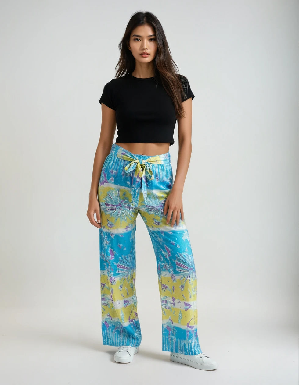 Loose fitting straight legged trousers with ties at the front and elasticated waist at the back for ideal comfort.