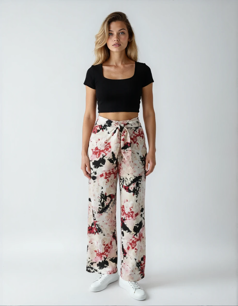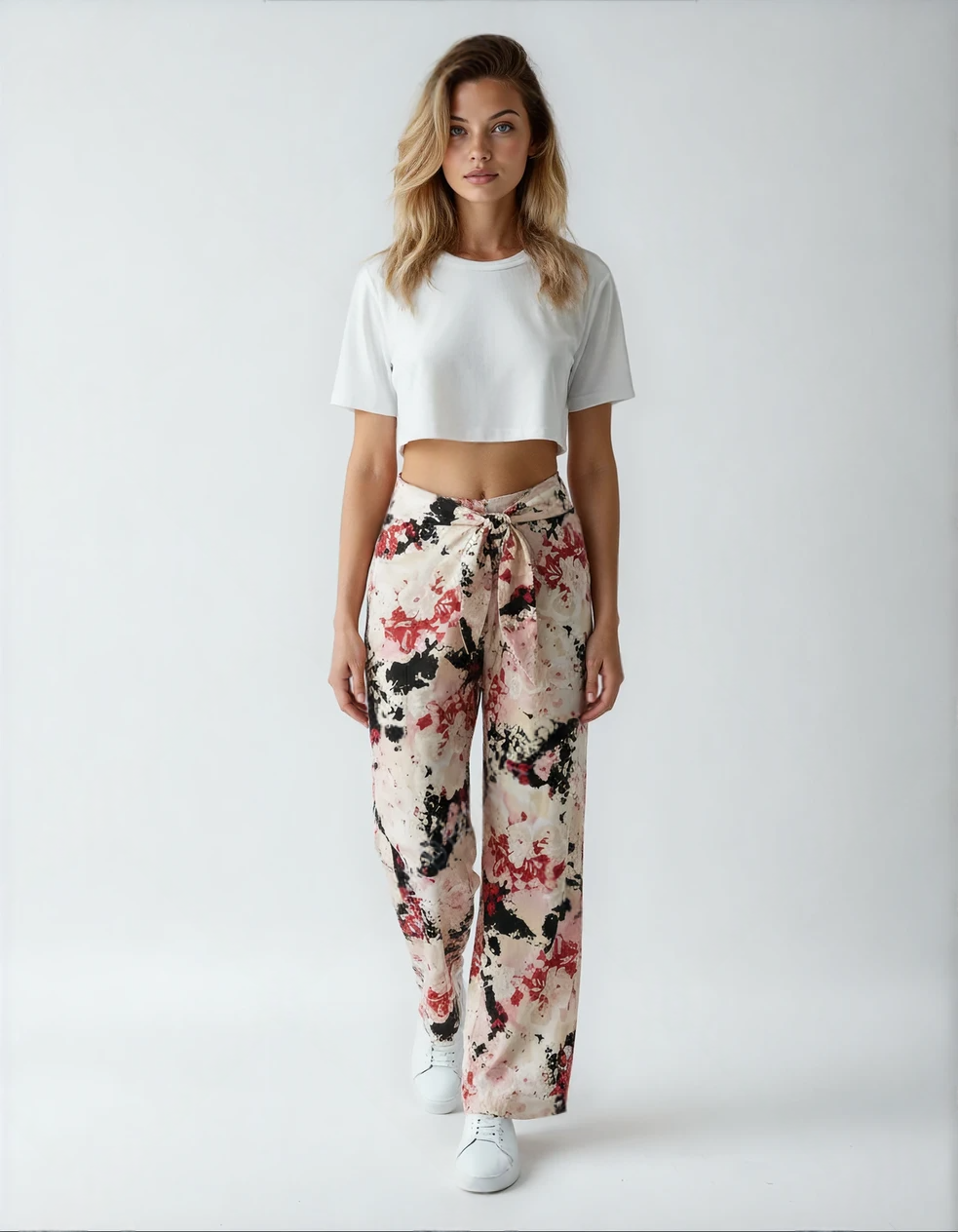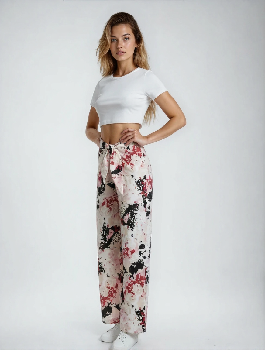 Loose fitting straight legged trousers with ties at the front and elasticated waist at the back for ideal comfort.